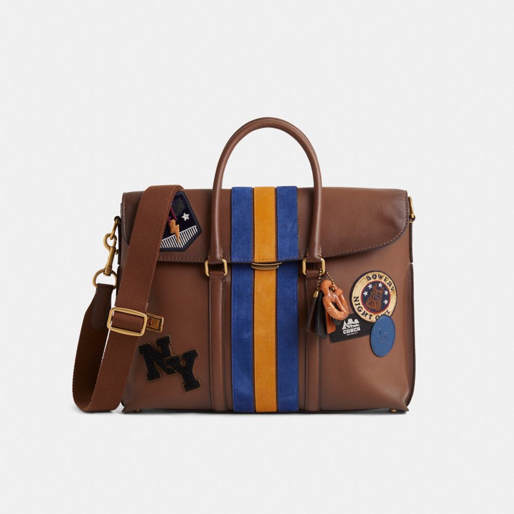 Reimagined by Eunice Chang with a bright Varsity Stripe and iconic Coach patches for a sporty touch, this roomy style has been expertly cleaned, conditioned and restored. Our talented craftspeople Fernando Gutierrez, Alfred Deaza and Yngrid Pichardo Baez hand-decorated the flap and front with a Coach Varsity Stripe and distinctive embellishments, repaired edgestain on anchor and gussets, spot-painted the back and corners, then added a playful repurposed charm. The Metropolitan Lock Portfolio is a no-fuss bag made for the modern man. Crafted of our buttery soft glovetanned leather, it has space for a 15" laptop and keeps gadgets organized with a spacious center zip compartment and multifunction pockets. Secured with a concealed clasp lock closure, carry it by hand or wear hands-free with the detachable strap.